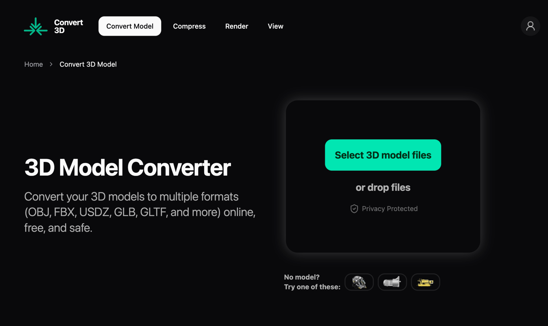 It supports 1,000+ conversion paths across formats like FBX, OBJ, GLB, USDZ, STEP, and STL. All processing stays local, ensuring privacy and fast performance.