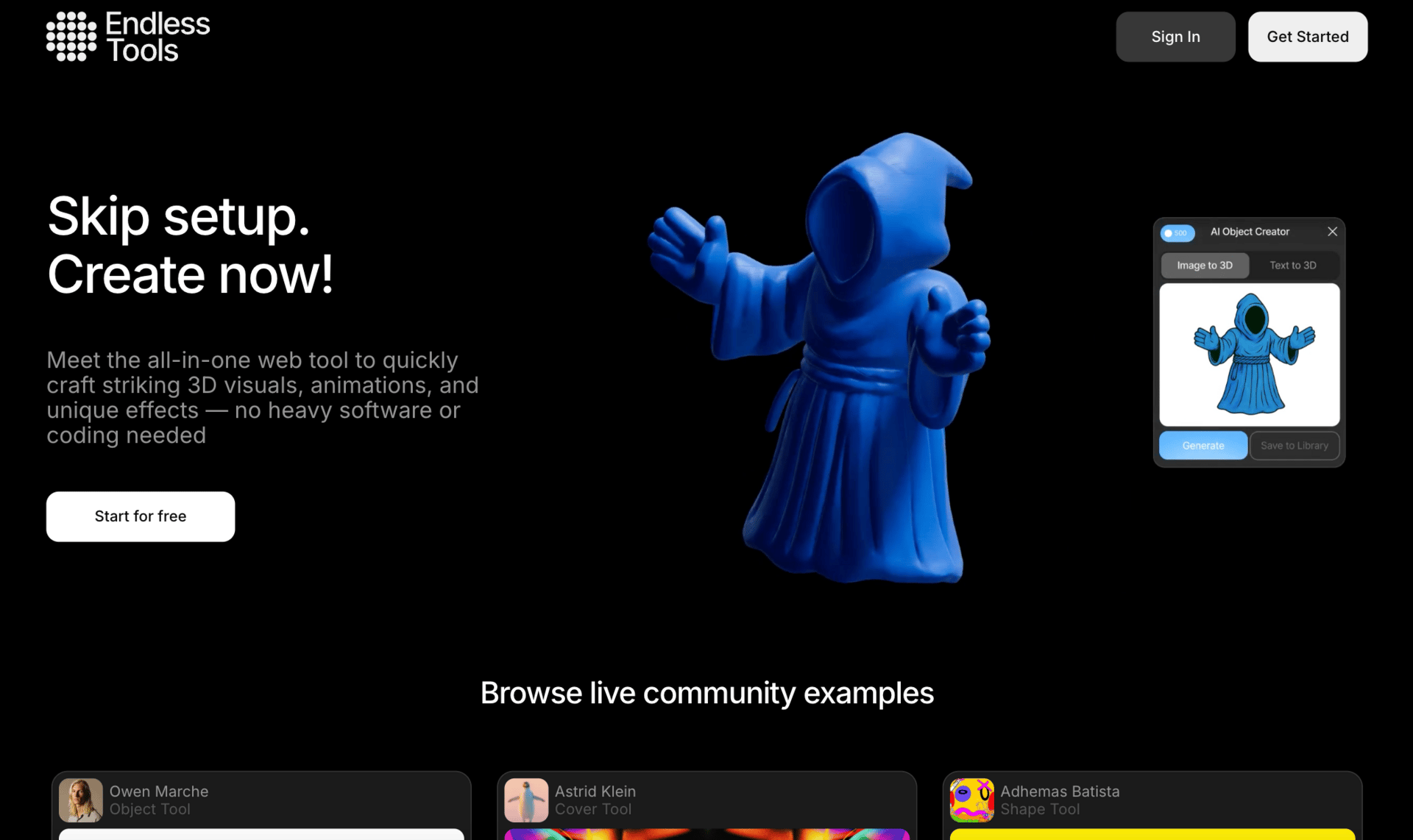 Endless Tools is a browser-based platform for fast 3D visual creation. It lets you generate 3D obje