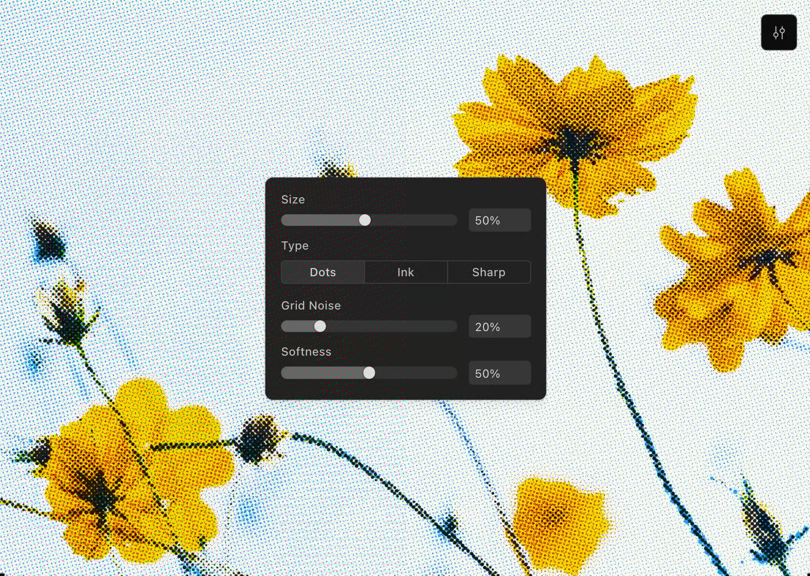 Designers can choose between Dots, Ink, or Sharp modes, and customize each CMYK channel independently for duotone, pop-art, or vintage looks.