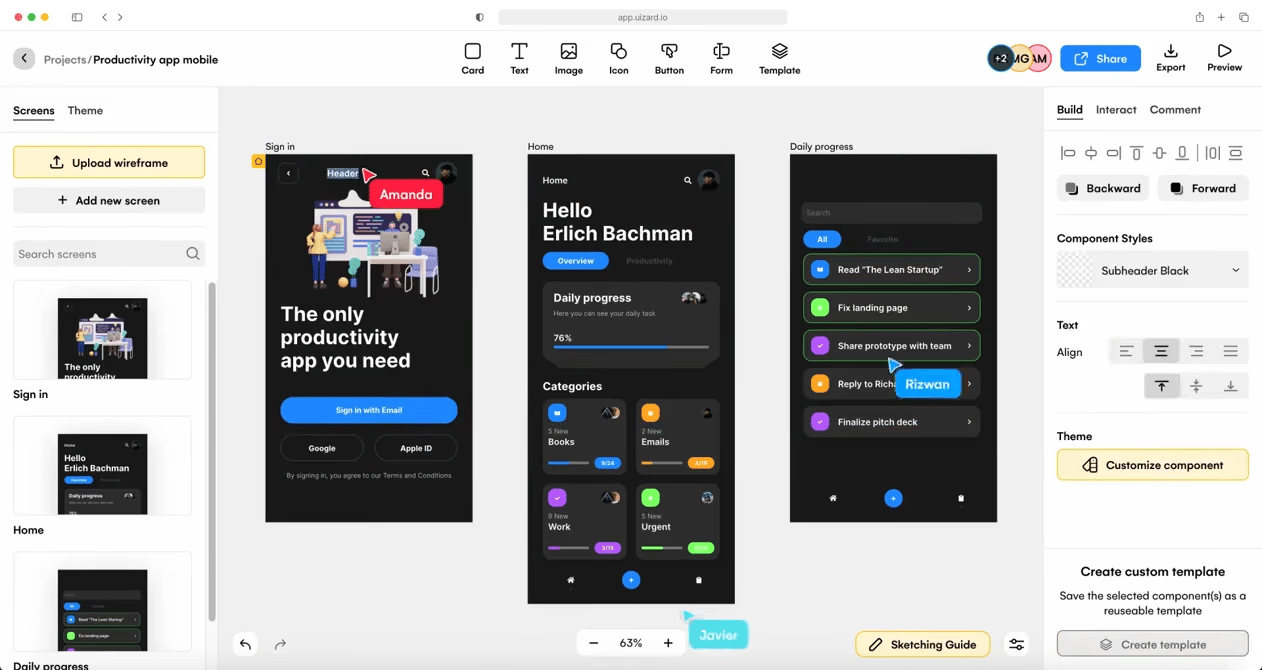 Uizard is made for ideation and MVP work, not deep vector or design system control. The drag-and-drop editor, templates, components, and collaboration tools keep workflows simple and fast.
