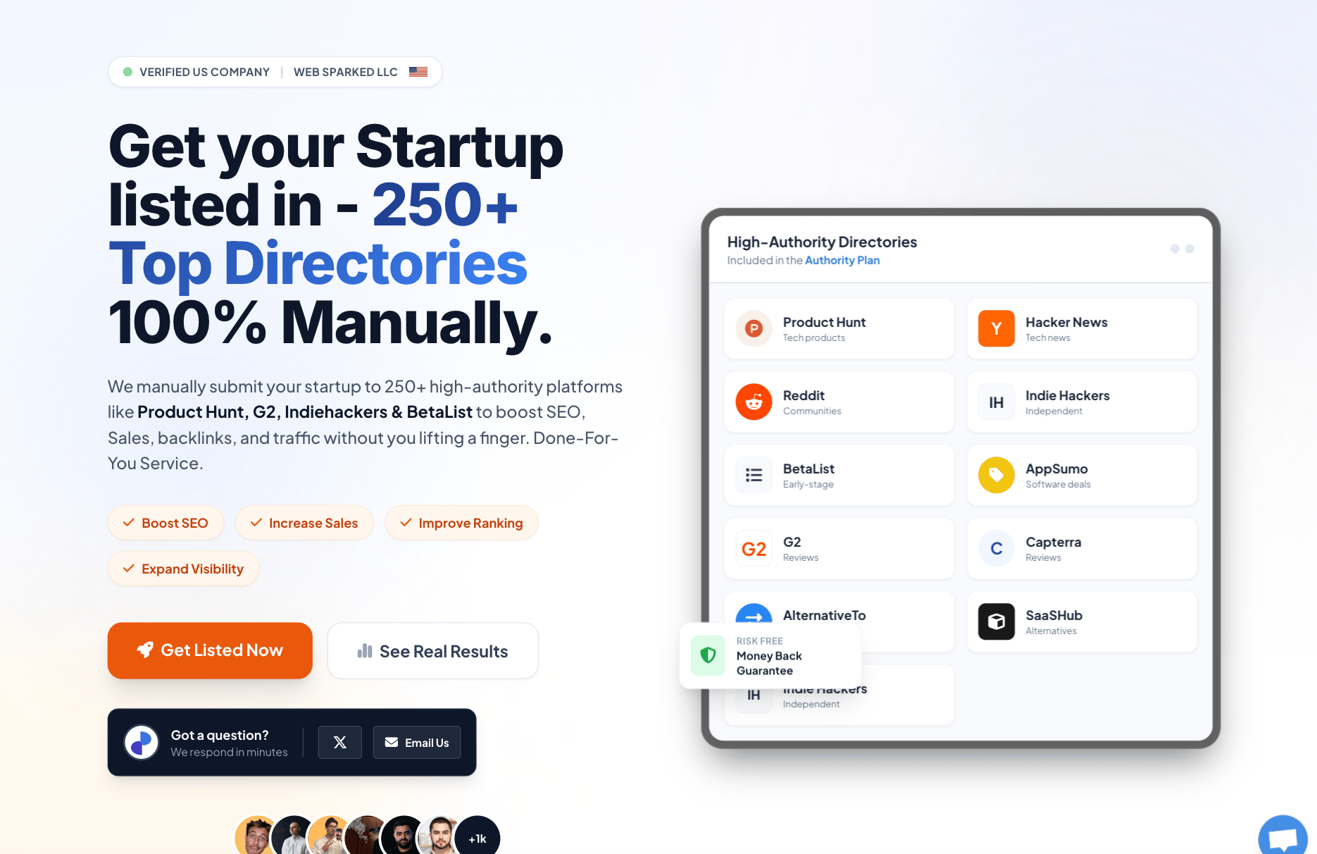 StartupSubmit is a done-for-you service that manually lists your startup on 150 to 250 plus high-authority directories like Product Hunt, G2, Capterra, Indie Hackers, and BetaList.