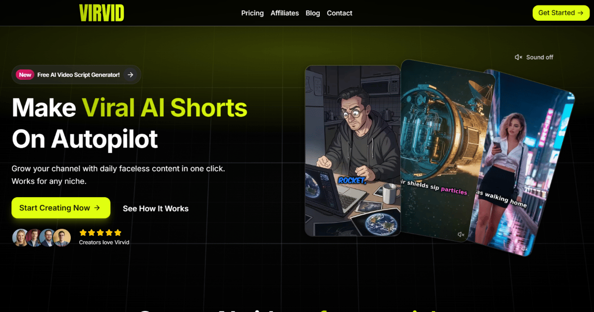 Virvid creates full AI shorts from idea to final video. Enter a topic, and it writes the script, generates visuals, adds voiceovers, music, and captions.